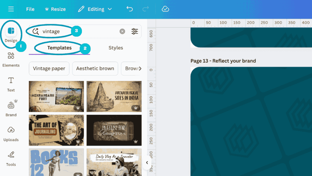 Within the editor area, go to the ‘Design’ tab (1), and in the ‘Templates’ area (2) search for existing templates in the style that you’re looking for e.g. ‘Vintage’ (3):