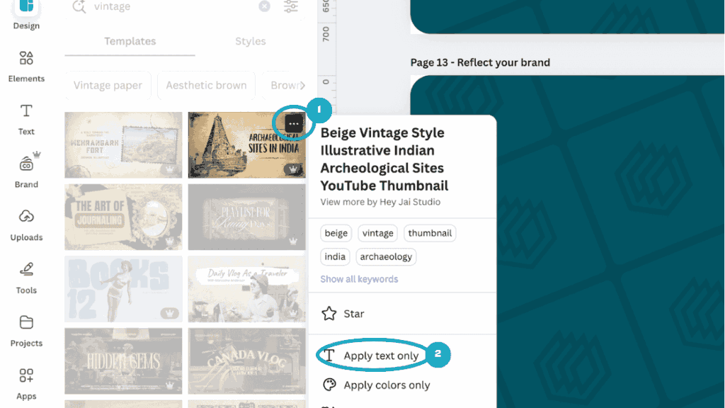 Then hover over a template that has fonts that you’d like to use in your existing design, click on the three dots (1), and then click ‘Apply text only’ (2):