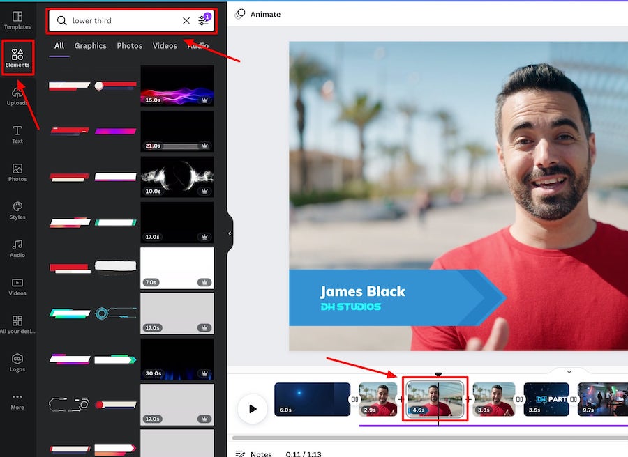 It’s super easy to add lower thirds and overlay graphics to video in Canva.