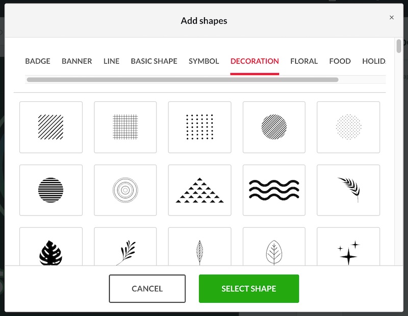 All you need to do is go to the shapes tab, click the ‘Add Shape’ button and a popup will appear with a library of shapes that you can browse through: