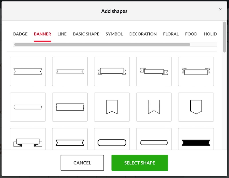 You can also add shapes to your logo design – these include badges, banners, lines, basics shapes (circles, squares, etc.), and much more: