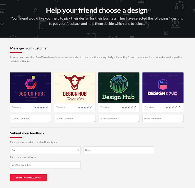 You simply choose which designs you want feedback on (you need at least 2 designs) and then you can share them via a link, social media, or via email: