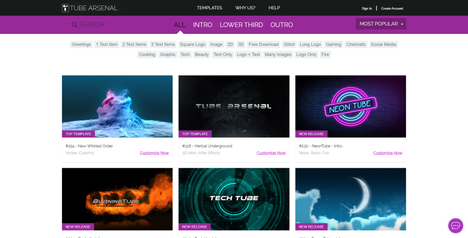 Tube Arsenal is another tool that only allows you to purchase individual templates. There’s no subscription so if you only need an intro template and you’re looking for an affordable option then Tube Arsenal could be the one for you.