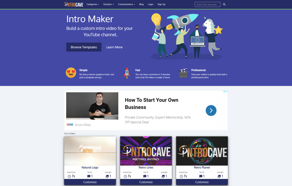 The tool is very easy to use. In just a few steps you can customize the intro template and you’re new intro will be ready in minutes. Finding the right template in your YouTube niche is made easy to by the fact they have the template listed by category.