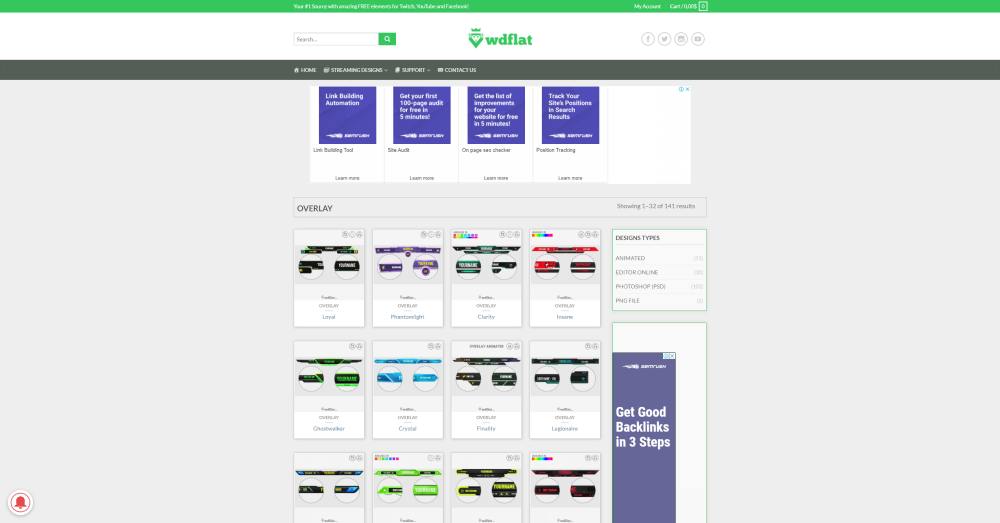WDflat is an online platform for streamers with free and premium items for Twitch and YouTube such as overlays, panels, offline banners, YouTube banners, logos, and more.