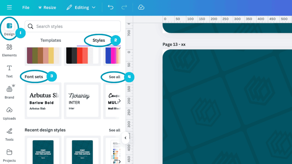 When you’re editing a design, go to the ‘Design’ tab (1), navigate to the ‘Styles’ section (2), scroll down to ‘Font sets’ (3) and then click ‘See all’ (4):