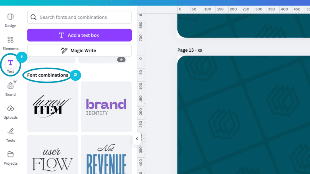 Go to the ‘Text’ tab in the editor area (1), and scroll down to the ‘Font combinations’ section (2). From here you can choose from a range of preset font combinations that Canva has created: