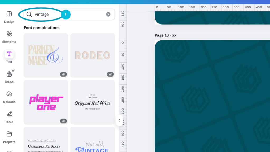 You can input a search term whilst in the ‘Text’ tab to narrow down the suggested font combinations. We’ll put in ‘Vintage’ again as an example (1):