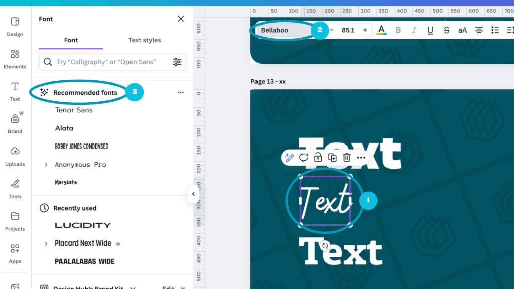Select a text element in your design (1), click on the font options (2), and scroll down until you get to the ‘Recommended fonts’ (3):