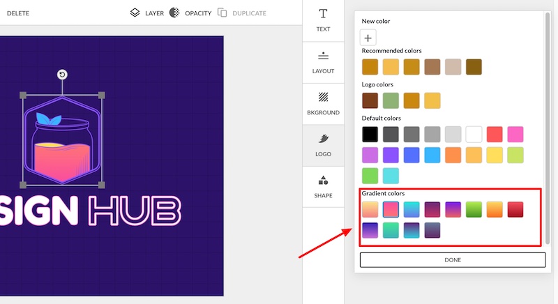 BrandCrowd has some color gradients that you can utilize for the graphic elements of your logo design, which is a great feature. Unfortunately, you can’t customize these though, you can only use the preset color gradients that they offer: