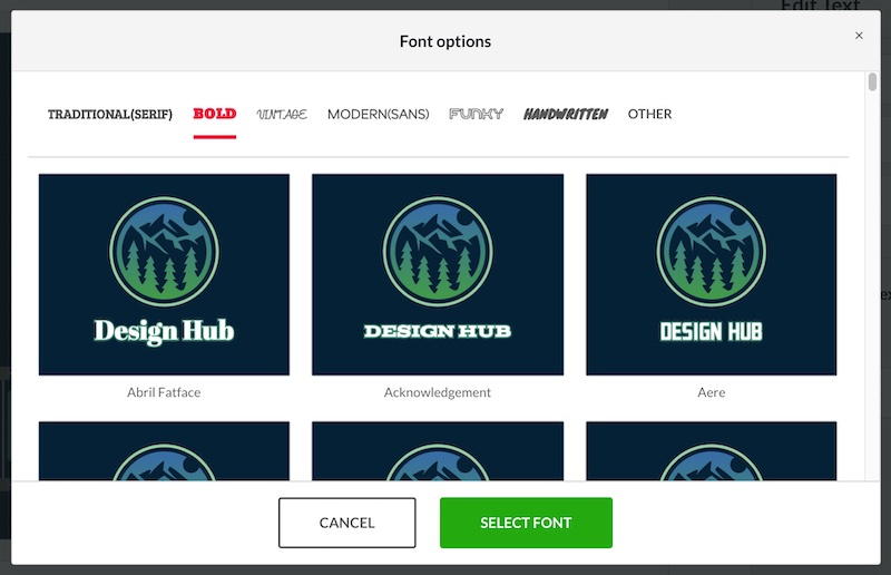 When you click on the ‘See Options’ button next to the font you’re currently using for your logo, a popup appears with a preview of alternative fonts: