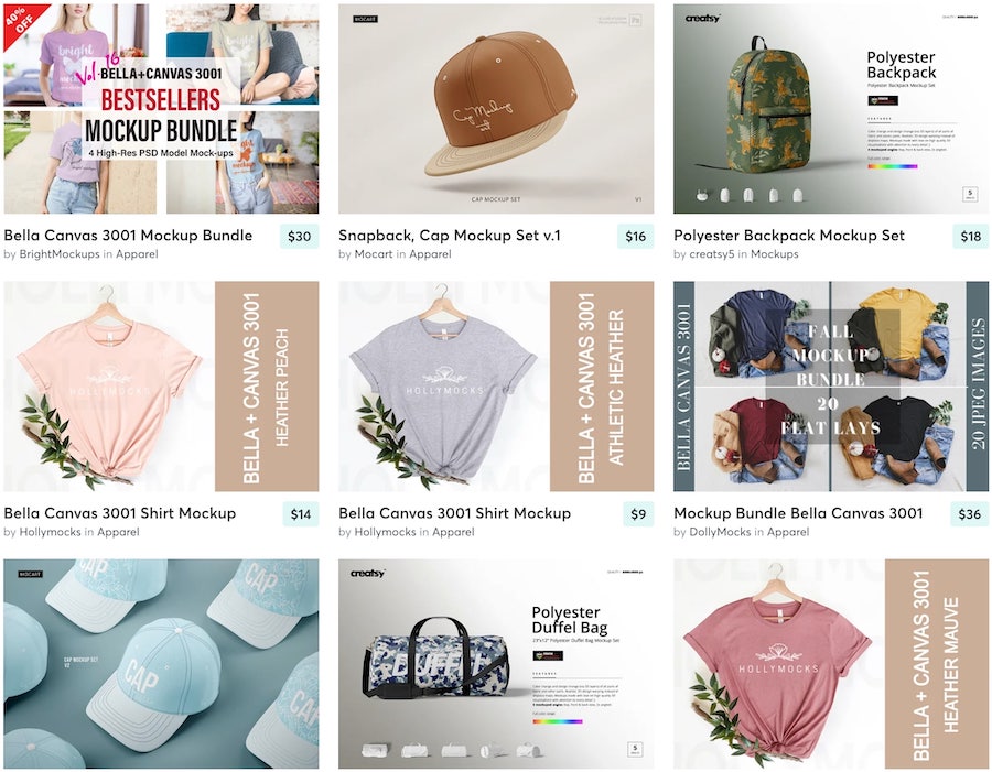 As a print on demand seller you’ll likely find t-shirt mockups (and other mockup types) for the brands you’re selling such as Bella+Canvas, Gildan, American Apparel, and many others. Most of the items are reasonably priced too!