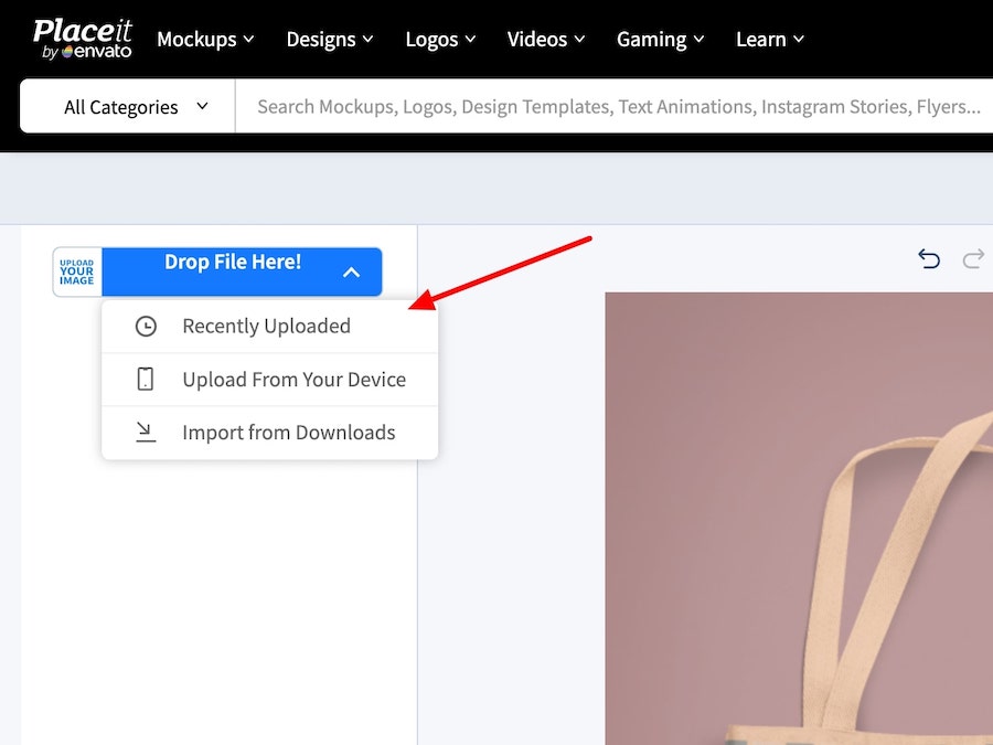 Placeit gives you the option to upload a design from your device, choose a recently uploaded design, or use a design that you created and downloaded previously on Placeit (Import from Downloads):