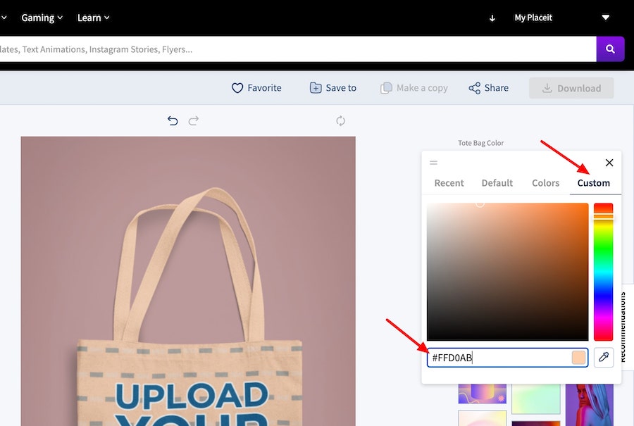 If you’re creating a mockup for an existing product in your print on demand store, you can grab the color hex code from your print on demand platform and put that into Placeit so it will match up perfectly: