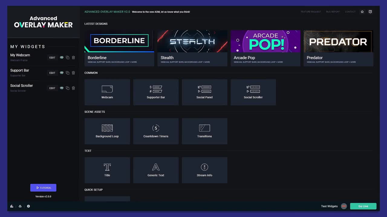 - Choose which assets you want to add to your stream (e.g. webcam, social panels, transitions, timers, backgrounds, etc.)